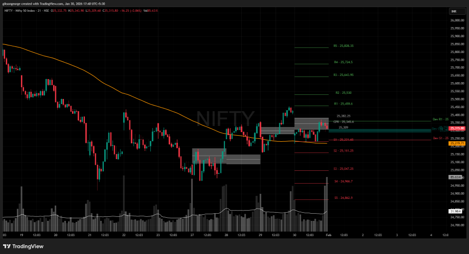 The Nifty 50 Index is currently pinned within a tight consolidation zone. The Central Pivot Range (CPR) for the session is positioned between 25,309 and 25,38. A close below 25,309 on Sunday would signal a bearish breakdown, whereas a move above 25,382 is required to reclaim bullish momentum.
