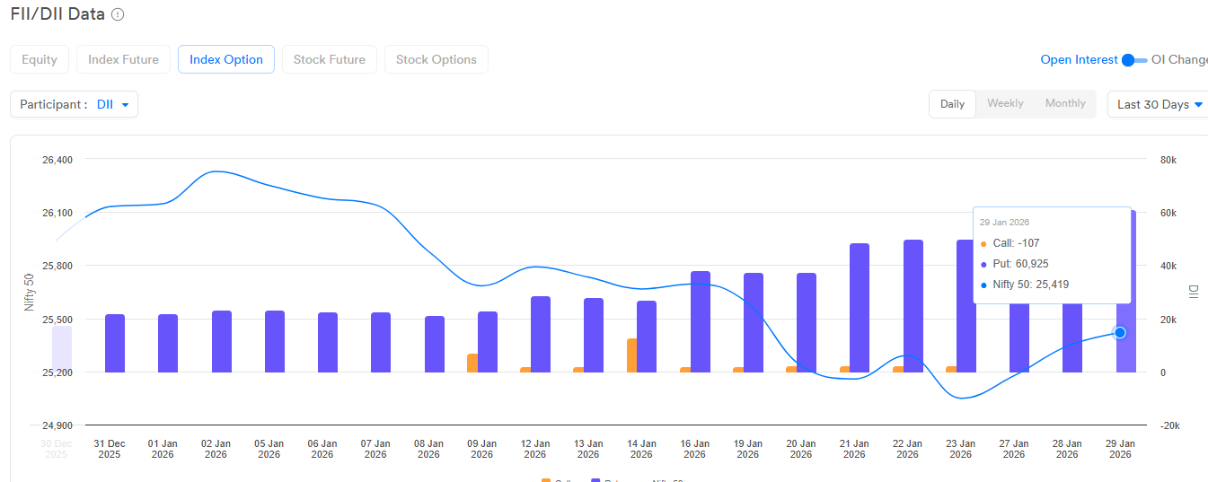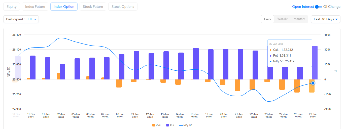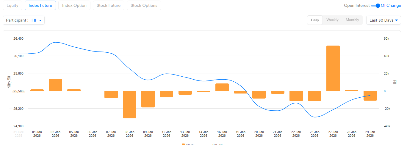 - FII Selling: Foreign Institutional Investors continued their selling streak in the cash segment, offloading shares worth ₹393.97 crore on January 29. For the month of January, FII outflows have exceeded ₹43,000 crore. FIIs are currently net short in index futures, indicating a defensive posture.