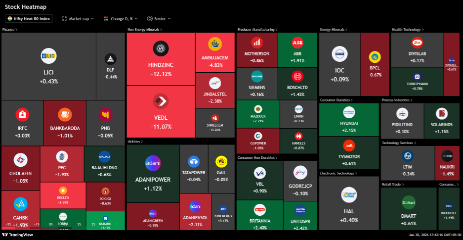 - Next 50 Weakness: Extreme volatility is visible in HindZinc (-12.12%) and VEDL (-11.07%).